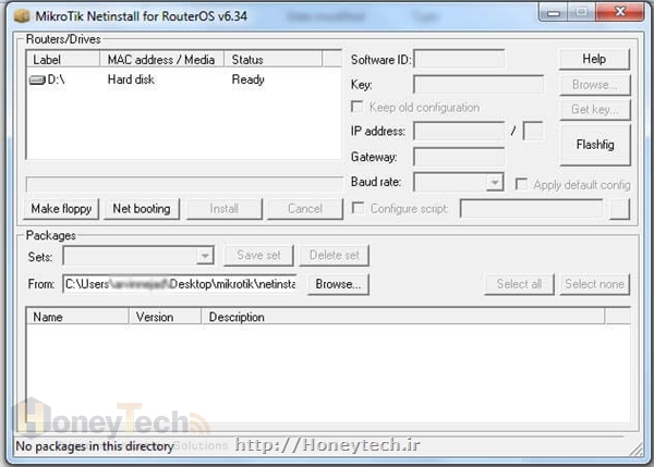 نرم افزار netinstall را اجرا می کنیم با پنجره ای مانند شکل زیر مواجه خواهیم شد .